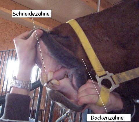Pferd ist ein Pflanzenfresser. Mit seinem langen Hals erreicht es leicht den Boden. Mit den Lippen erfasst das Tier das Futter und mit den Schneidezähnen wird es abgerissen. Die Zähne sind breit, lang und schräg nach vorne gerichtet. Mit den Backenzähnen wird die Nahrung zerkaut. Du kannst das Alter eines Pferdes an den Schnittflächen erkennen. Dort bilden sich so wie bei einem Baum Ringe. |